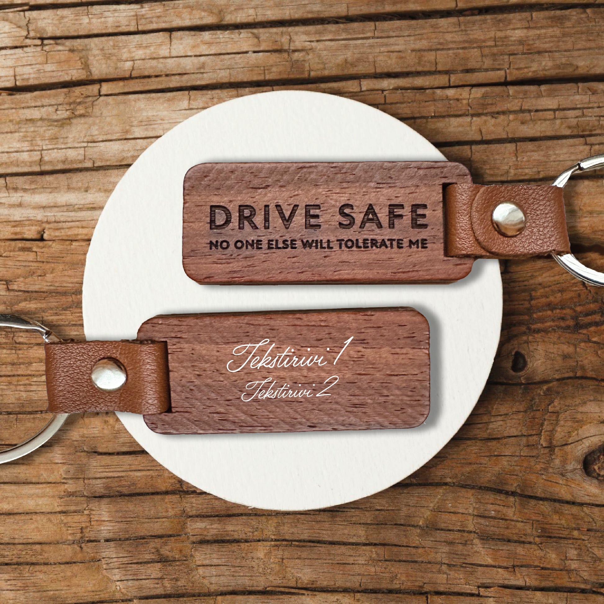The text "Drive safe, no one else will tolerate me" is always standard on one side of the keychain, but you can engrave your own text on the other side if you wish.