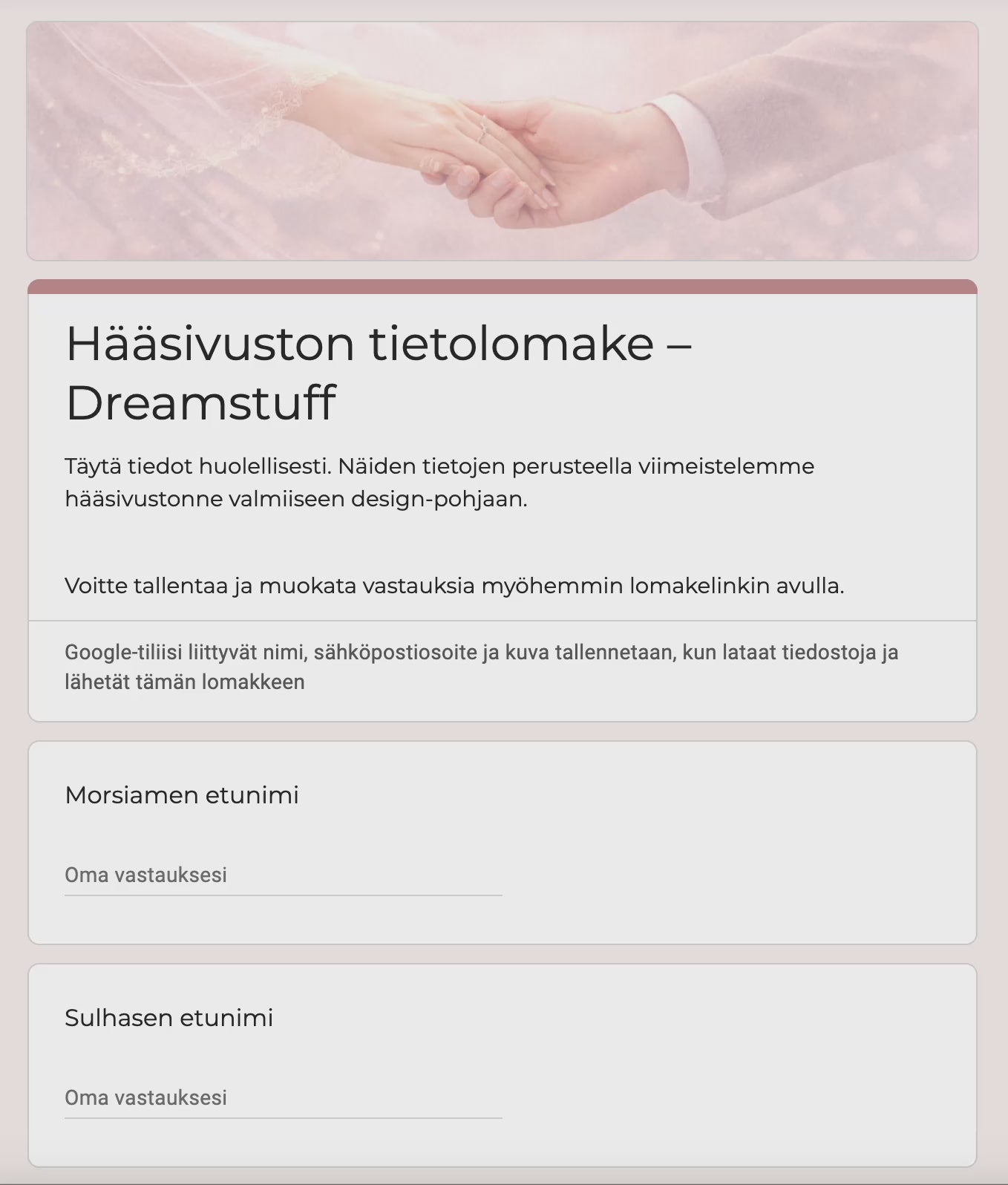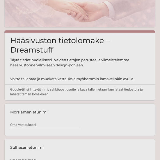 - Klikkaa tilausvahvistuksessa olevaa linkkiä "Avaa hääsivuston tietolomake" ja täytä hääsivuston tietolomake ohjeiden mukaan. Lomakkeen mukana myös latauslinkki kuvia varten.