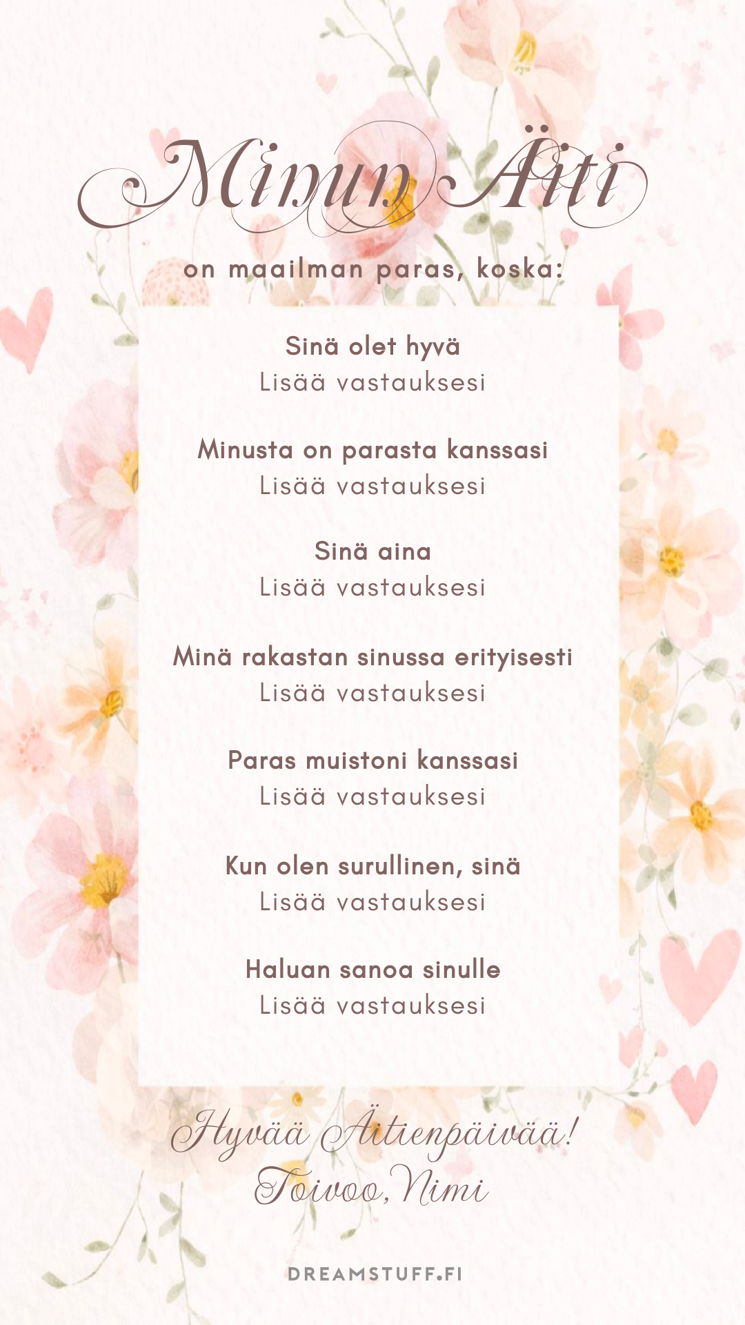 Muokattava digitaalinen äitienpäiväkortti, jonka teet itse editorissa. Ei ohjelmia tai latauksia – muokkaus toimii verkkoselaimessa.