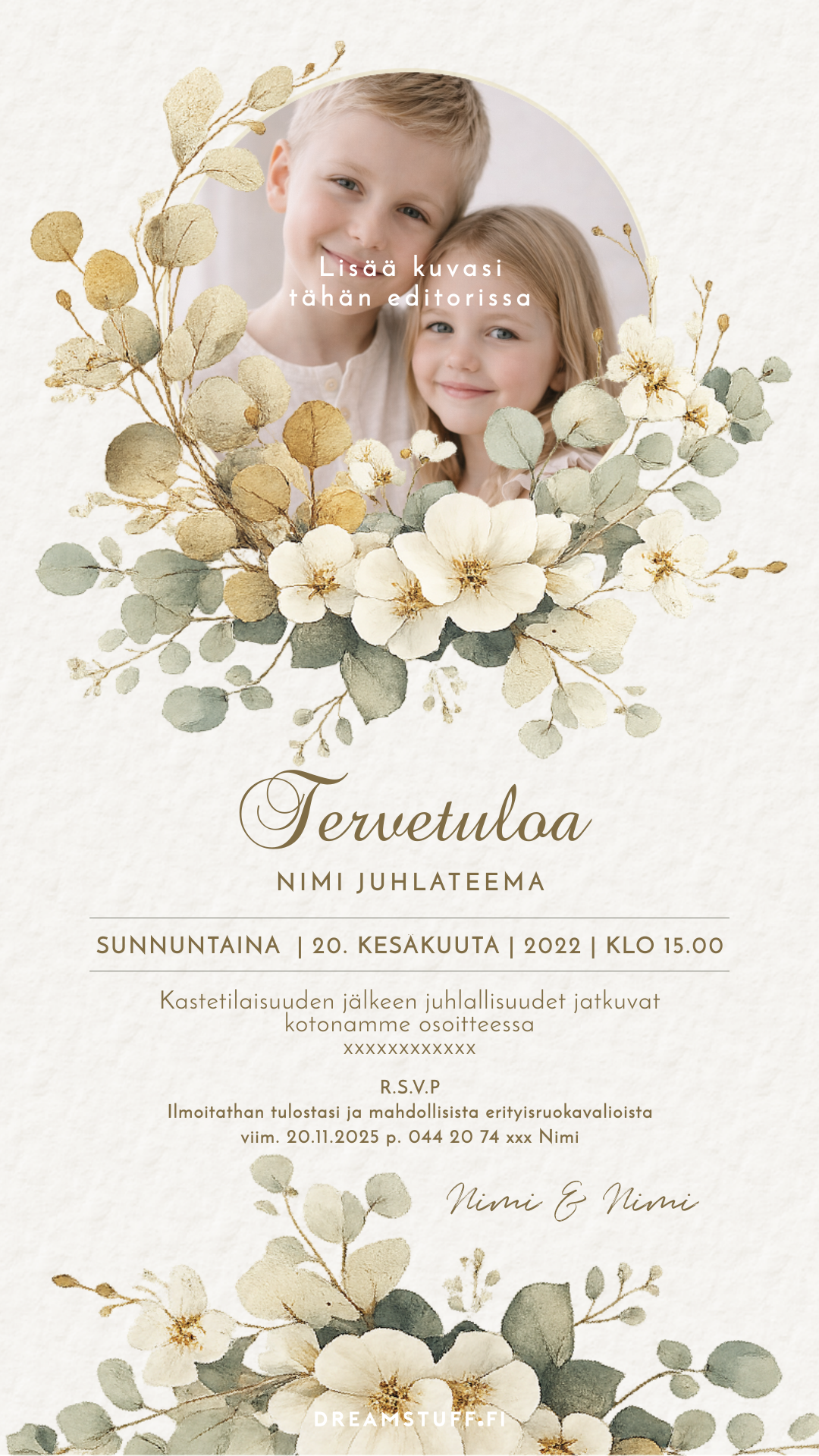 Muokattava digitaalinen kutsu, jonka teet itse editorissa. Ei ohjelmia tai latauksia – muokkaus toimii verkkoselaimessa.