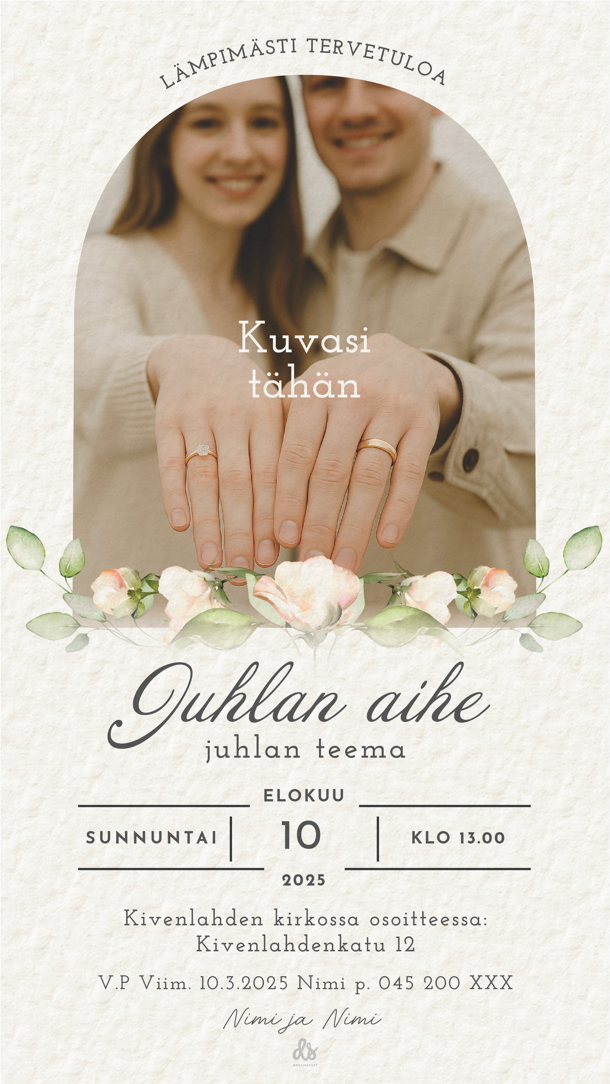 Digitaalinen kutsu on ekologinen ja helppo tapa kutsua vieraat juhliin. Saat personoidun kutsun sähköpostiisi JPG-muodossa 48 tunnin sisällä tilauksesta arkipäivisin. Muista jättää tilauksen yhteydessä toimiva sähköpostiosoitteesi – kutsua voi tarvittaessa muokata kerran sen toimituksen jälkeen.