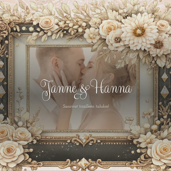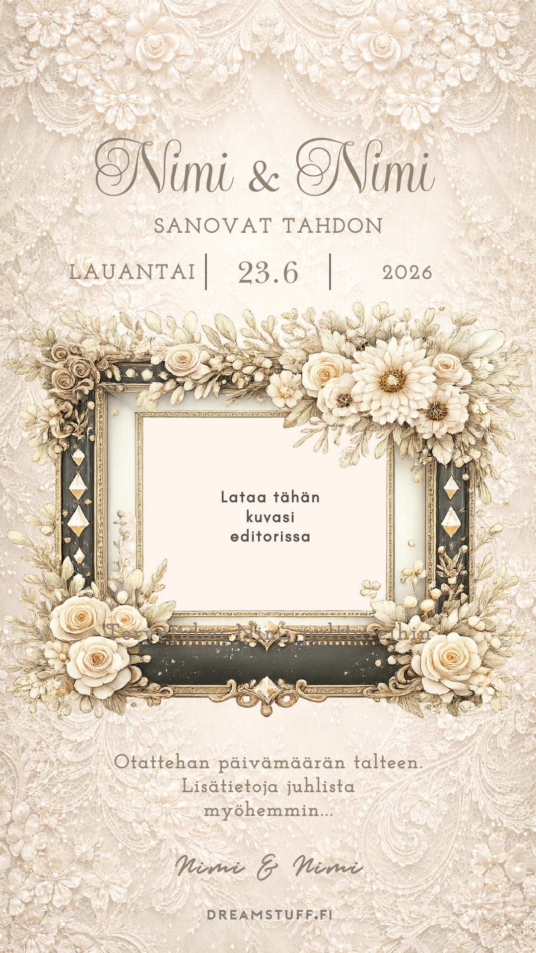 - Muokkaa Save the Date ja kutsu: nimet, päivämäärä, aika, paikka, kuvat ja tekstit.