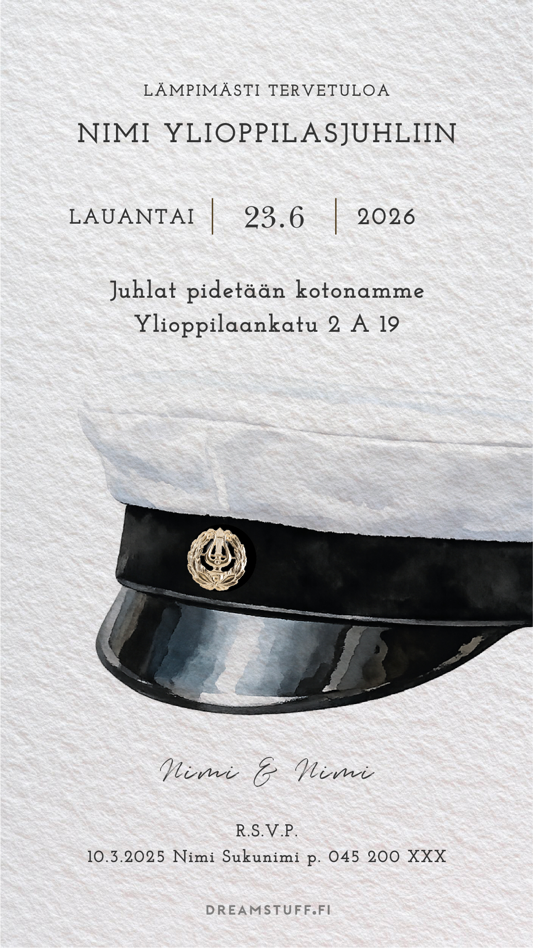 Muokattava digitaalinen ylioppilaskutsu, jonka teet itse editorissa. Ei ohjelmia tai latauksia – muokkaus toimii verkkoselaimessa.