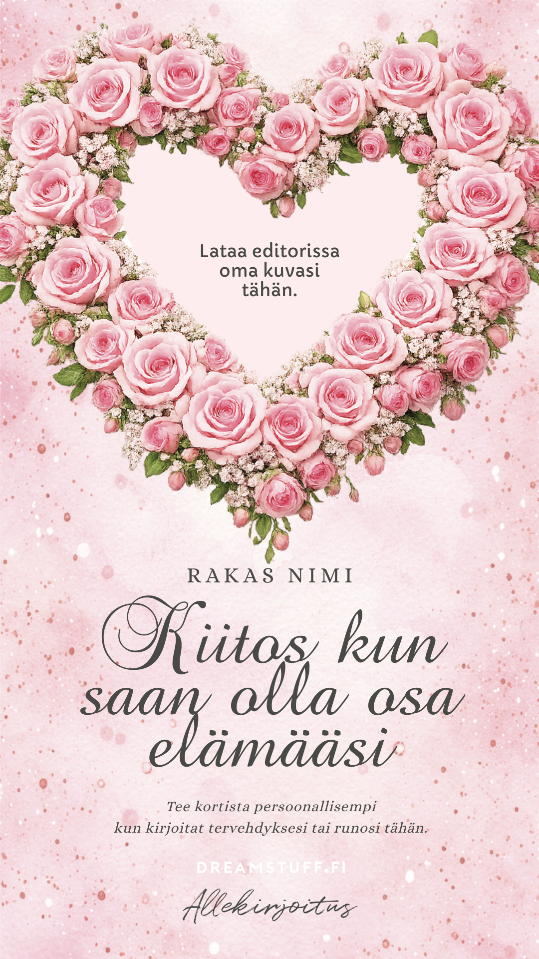 Muokattava digitaalinen ystävänpäiväkortti, jonka teet itse editorissa. Ei ohjelmia tai latauksia – muokkaus toimii verkkoselaimessa.