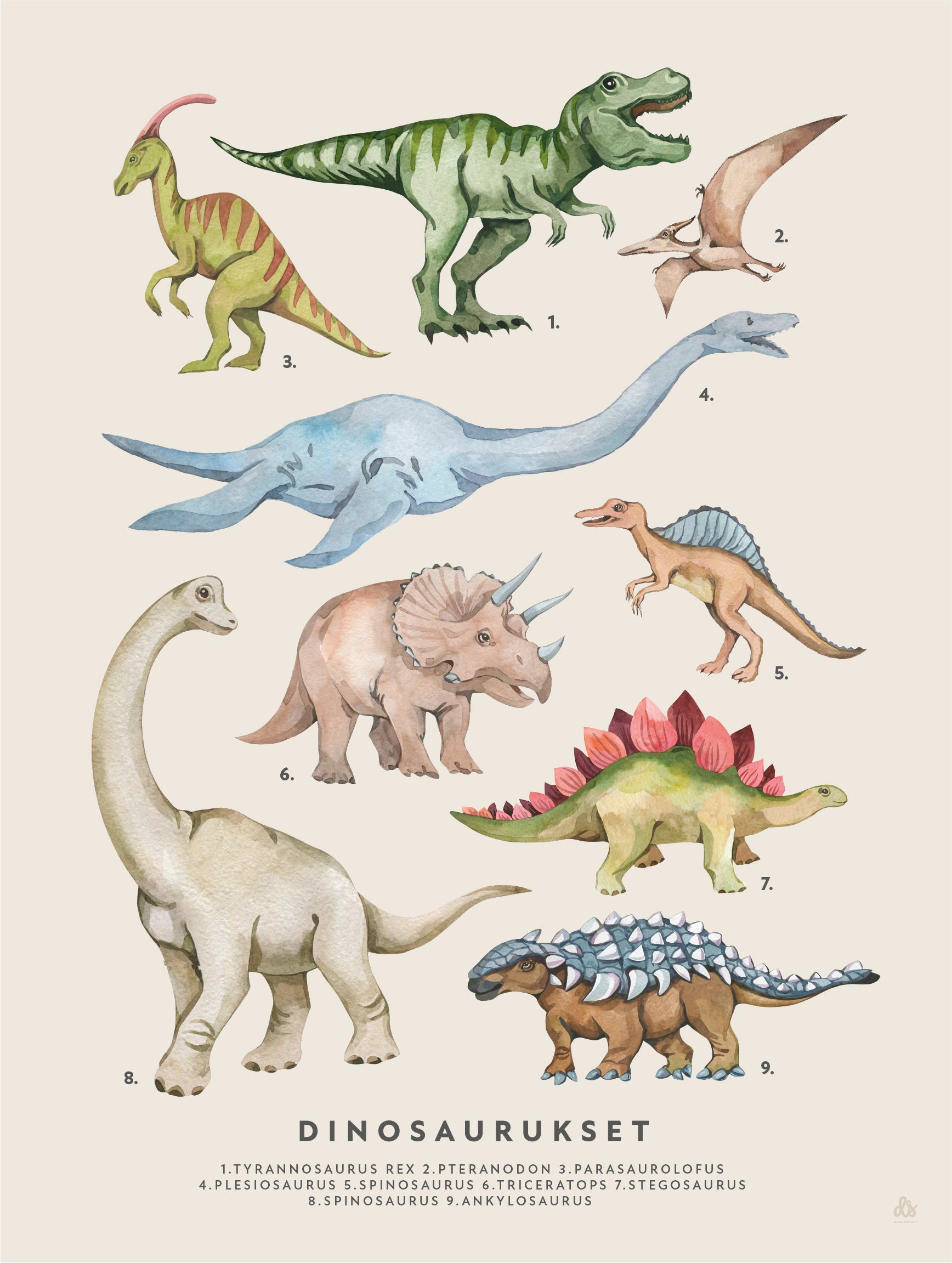 Jokaisen dinosauruksen kohdalla on kirjattuna lajikkeen nimi, siksi juliste kuuluu verkkokauppamme "opettavaisiin julisteisiin". Aikuisen avustuksella lapsi pian oppii luettelemaan julisteessa esiintyvät dinosaurukset!