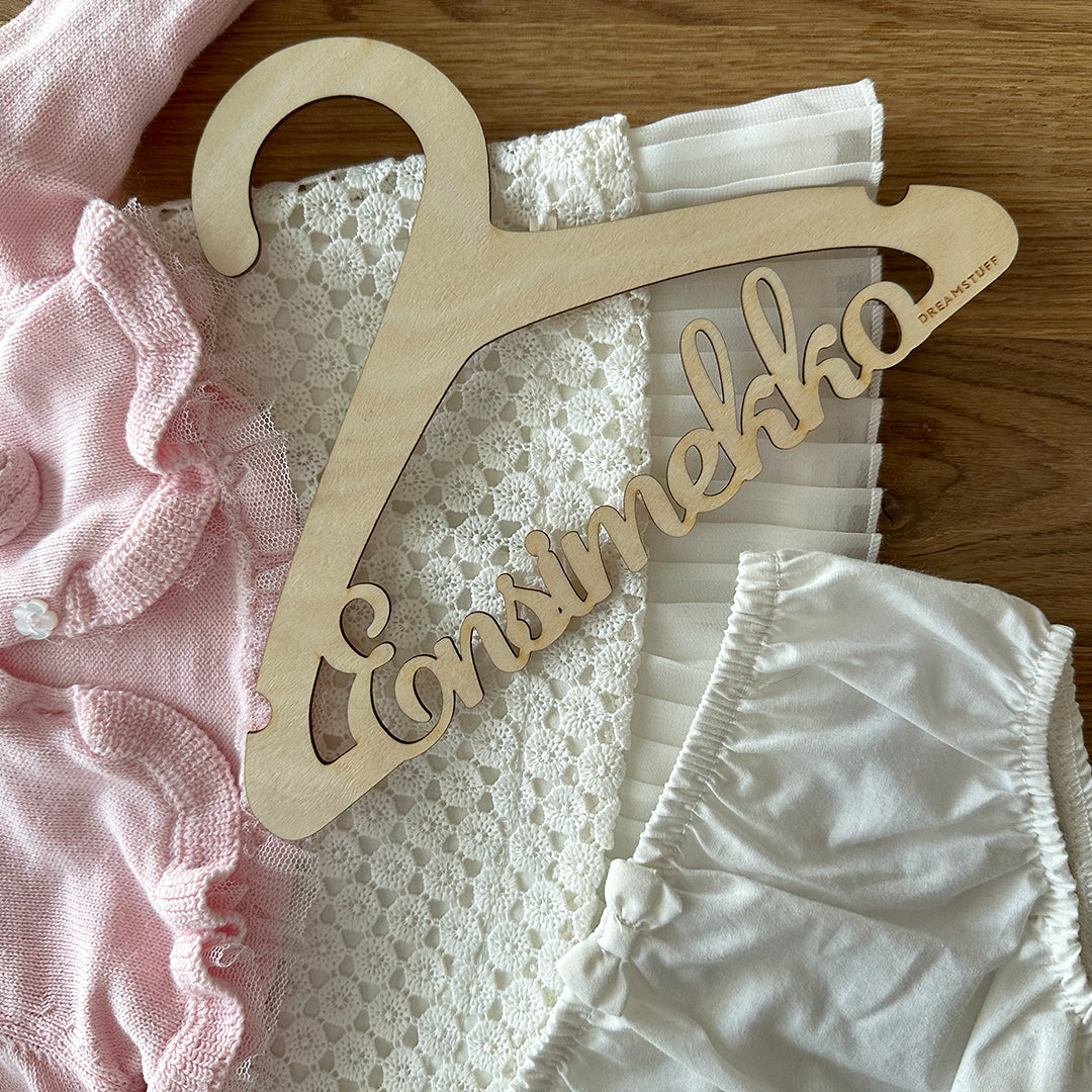 Ihana lahja vauvalle esim. kastelahjaksi. Henkariin voit ripustaa muistoksi esim. vauvan mekon jonka hän puki ylleen ensi kertaa.
