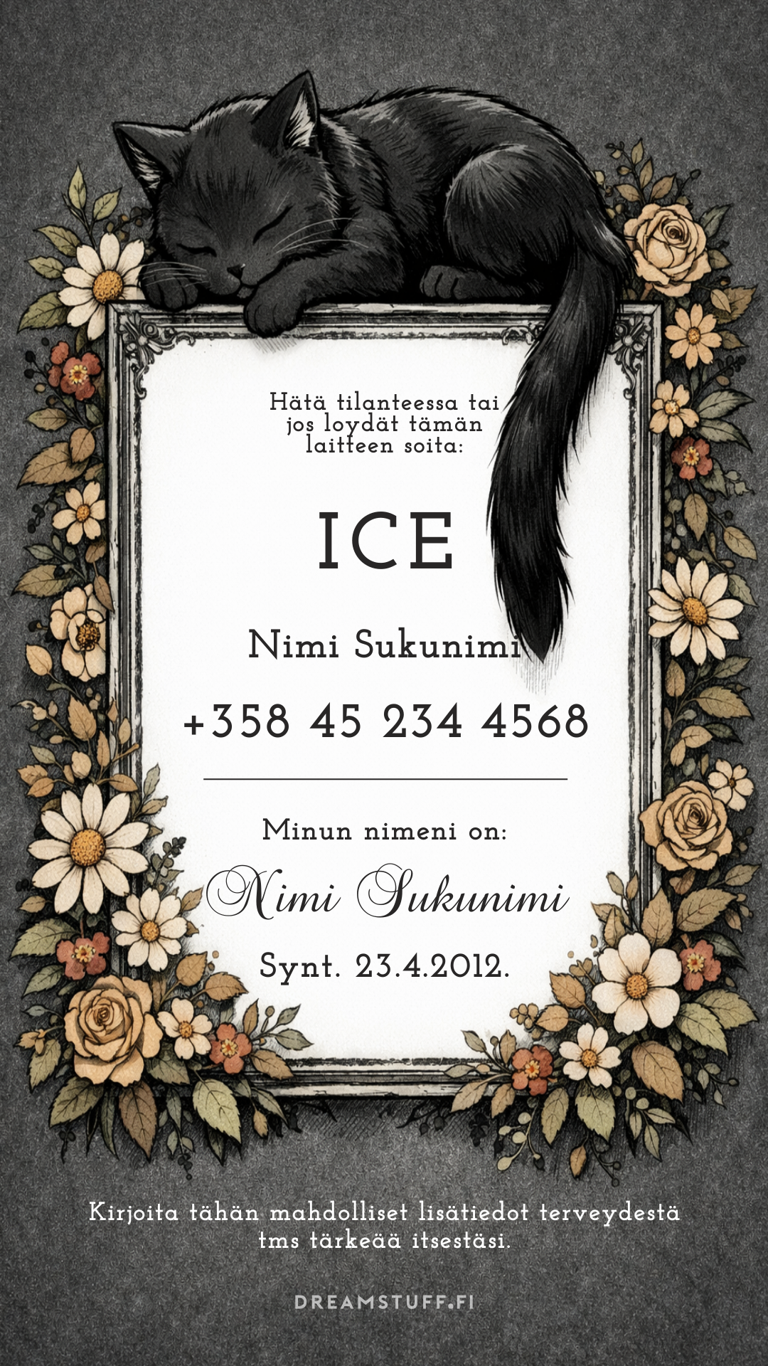 ICE-näyttöön voit lisätä tärkeät tiedot, kuten nimen, lähiomaisen yhteystiedot, sairaudet, allergiat tai muut olennaiset tiedot. Hätätilanteessa nämä tiedot ovat heti nähtävissä puhelimen lukitusnäytöllä ilman, että puhelinta tarvitsee avata.