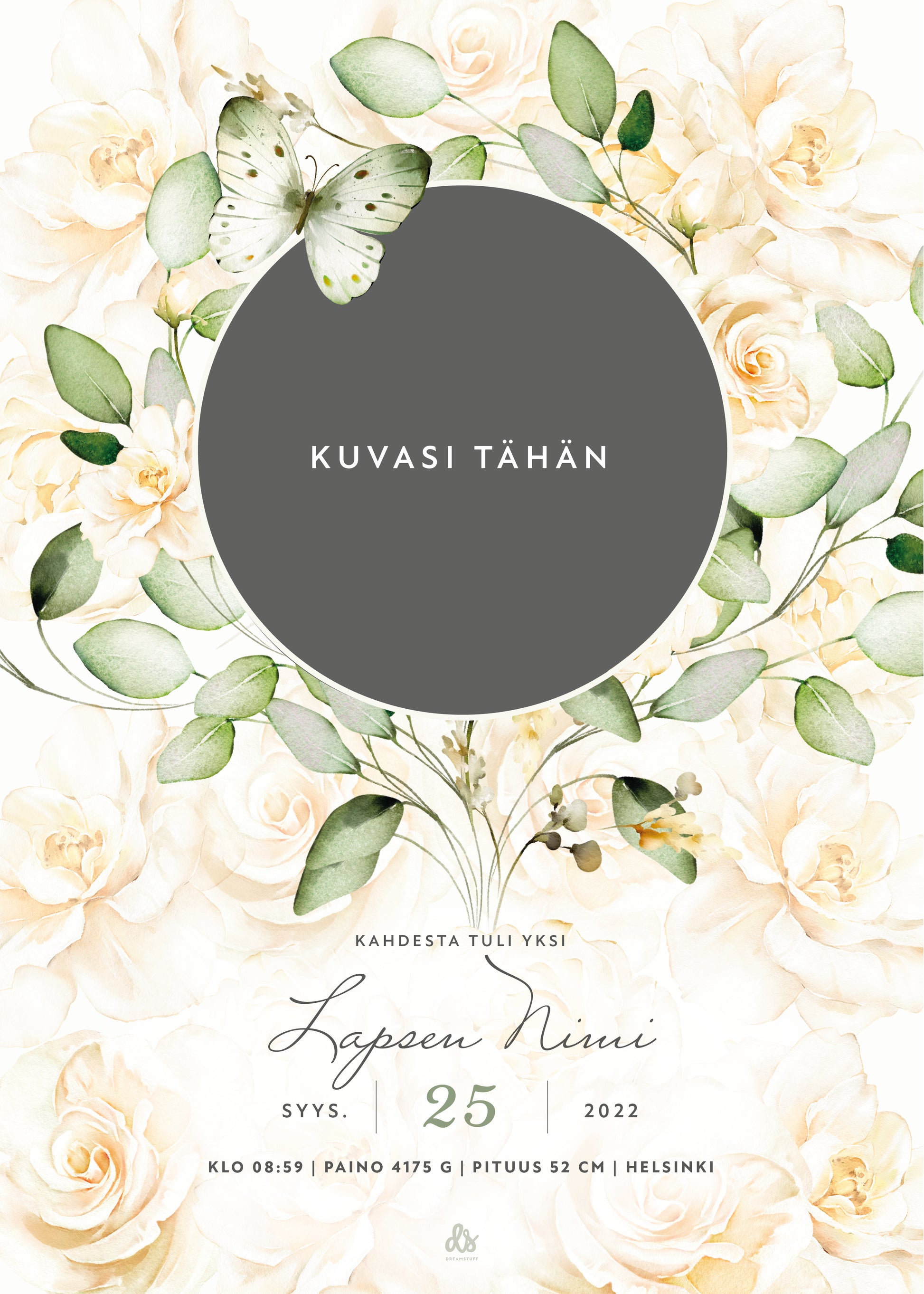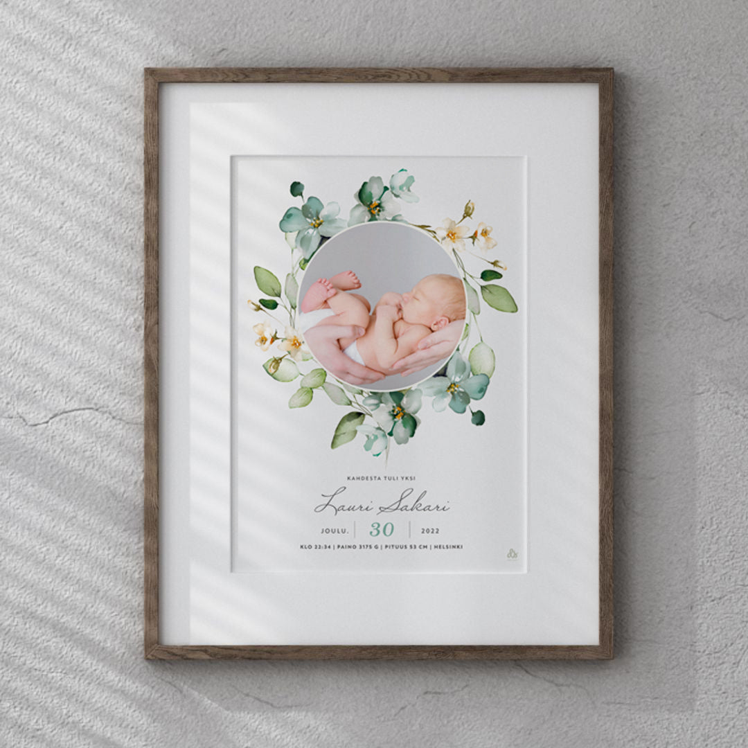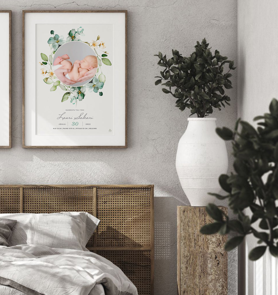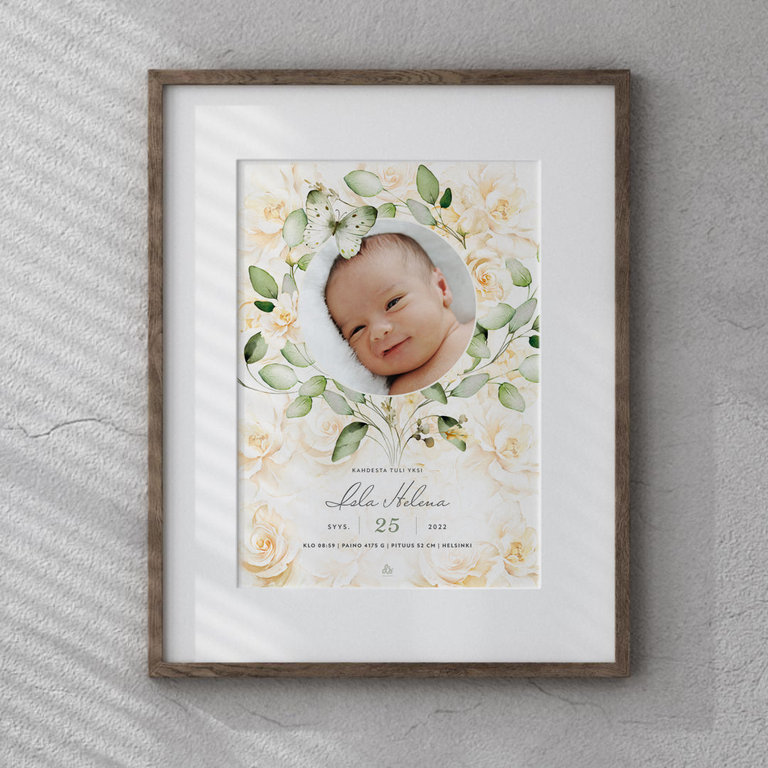 Julisteeseen riittää melko pelkistelty valokuva pienokaisesta sillä julisteen somistus tekee kuvasta koristeellisen. Tärkeää on että valokuva on tulostuslaatuinen n. 30 cm kokoisena.