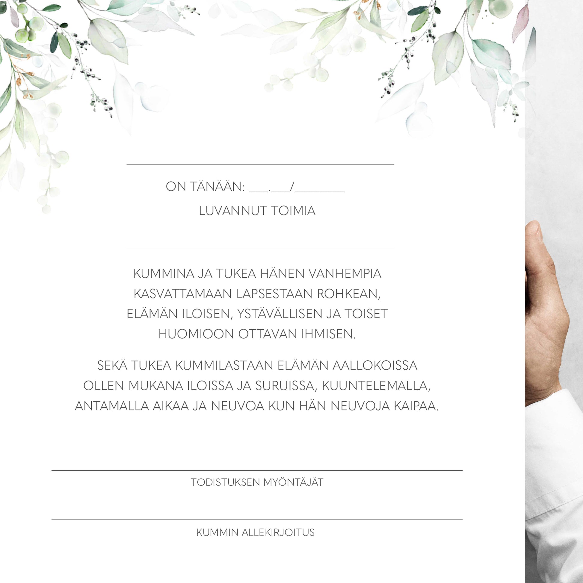 Kummitodistus kasteeseen on A5-kokoinen taitettava kortti, jonka kannessa on vesivärityyliset eukalyptuslehdet ja luonnonläheinen, minimalistinen design. Sisäpuolelle voidaan kirjoittaa kummilapsen, vanhempien ja kummin tiedot, jolloin todistuksesta tulee yksilöllinen ja arvokas muisto.