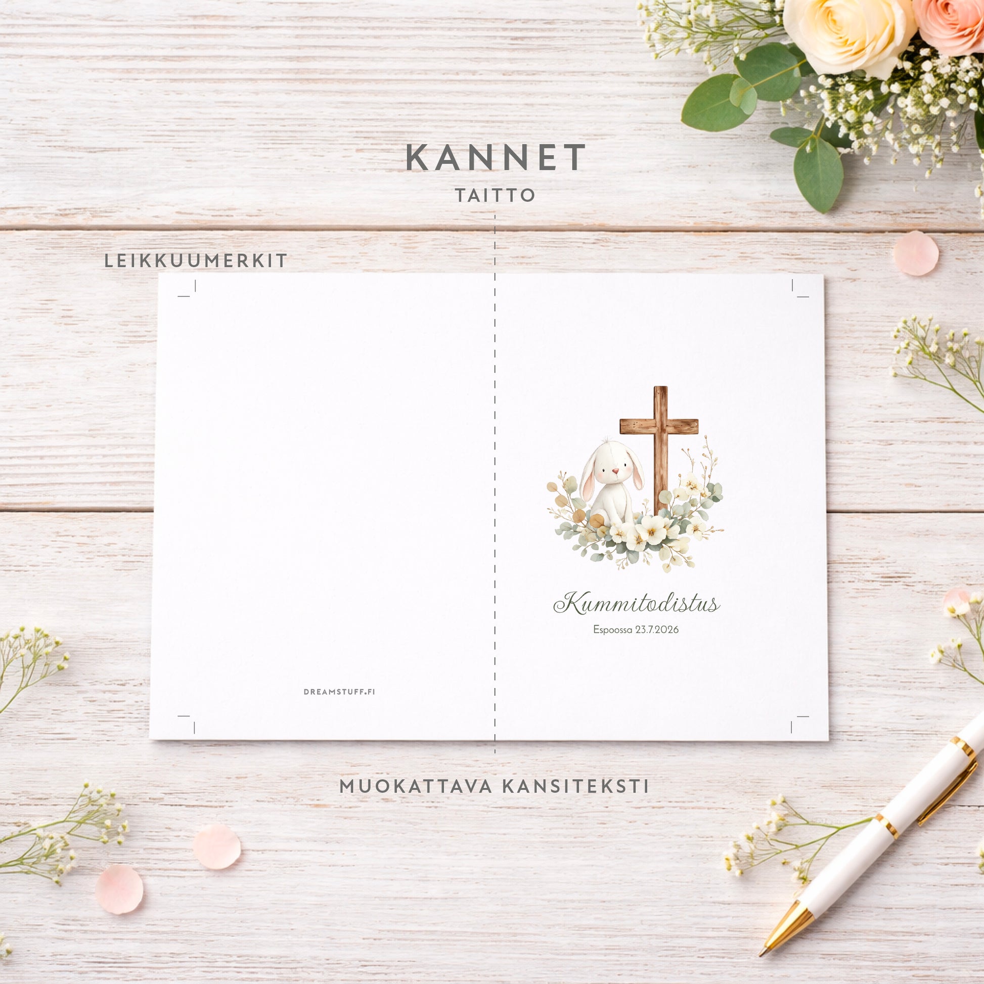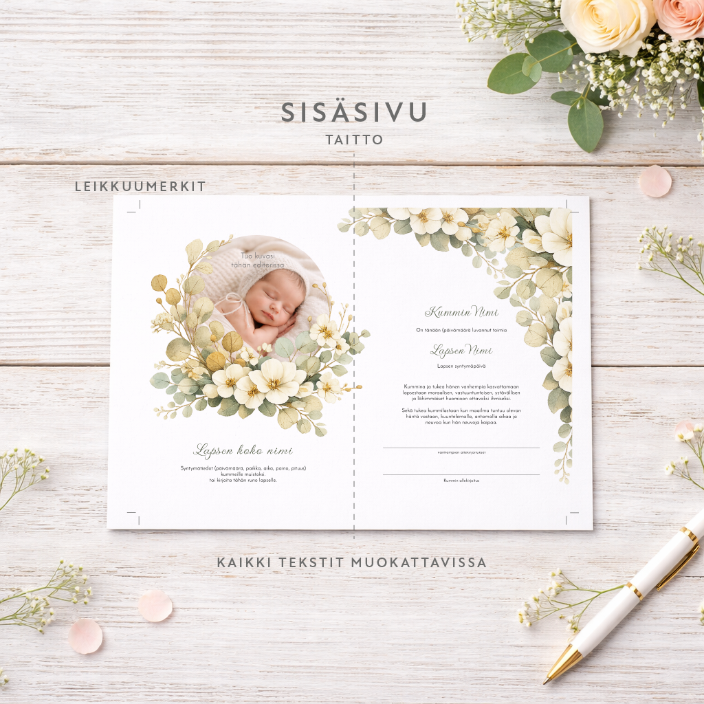Luo ainutlaatuinen muisto kummille ja lapselle. Tämä A5-kokoinen, taitettava kummitodistus viimeistelee juhlapäivän ja säilyy rakkaana muistona vuosien ajan. Voit lisätä kummitodistukseen myös oman kuvan – esimerkiksi vauvan kuvan – suoraan valmiiseen kehykseen.