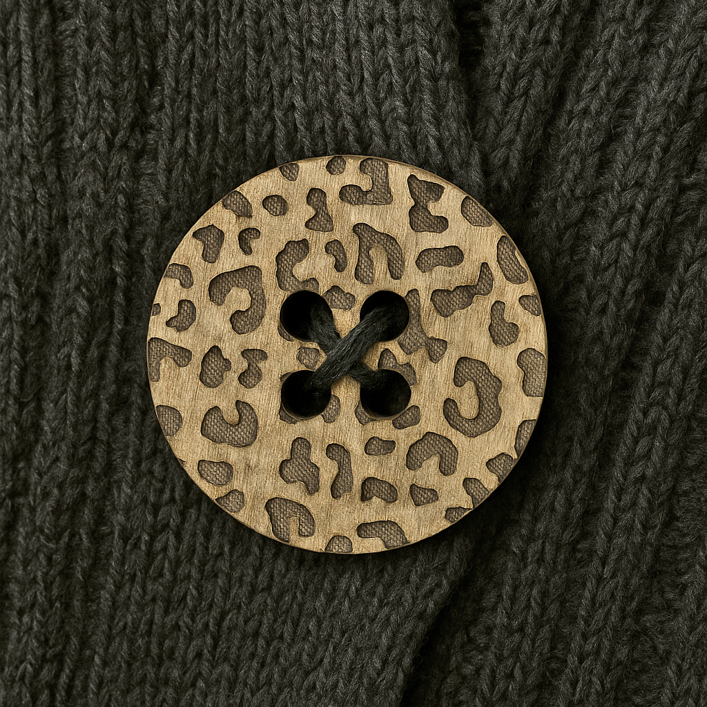 Tämä pantterikuosinen puunappi tuo käsitöihin ja asusteisiin ripauksen rohkeaa tyyliä ja luonnollista lämpöä. Jokainen nappi on valmistettu Suomessa tarkasti laserleikkaamalla ja -kaivertamalla 2 mm mahonkivanerista, joka korostaa kauniisti puun pintaa ja kuosin yksityiskohtia.