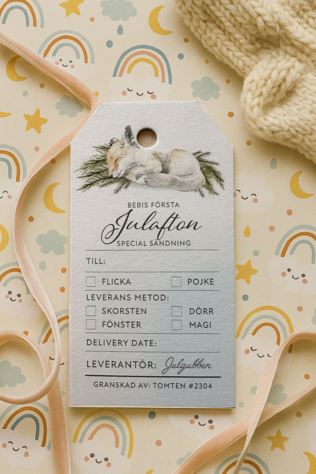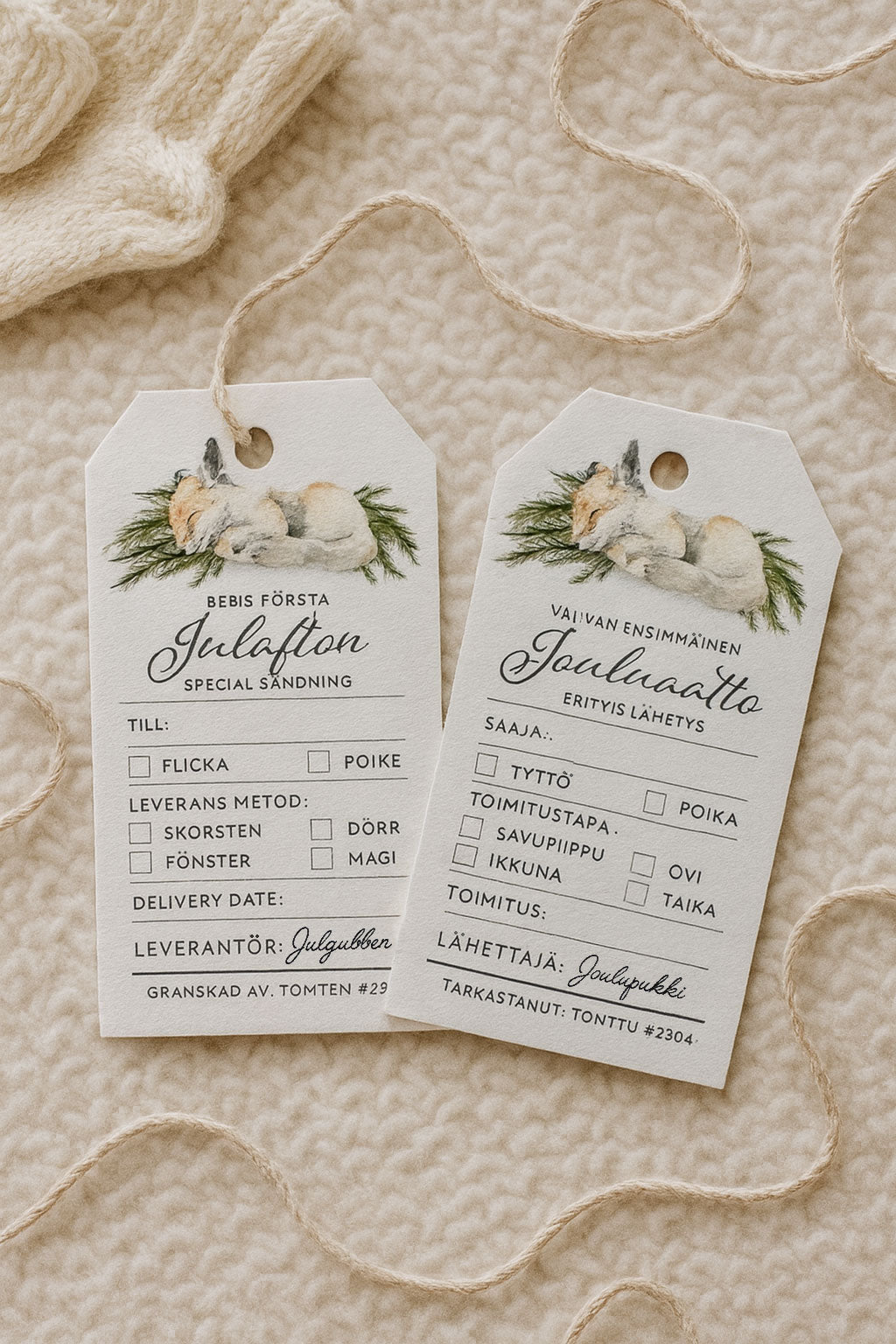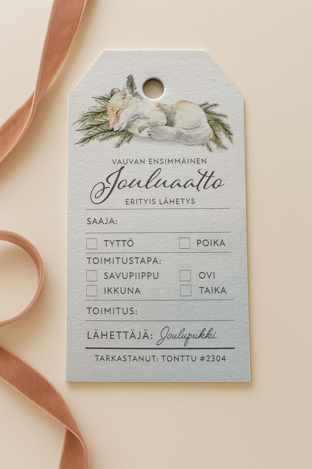 - Käyttötarkoitus: Vauvan ensimmäisen joulun lahjakortti / pakettikortti