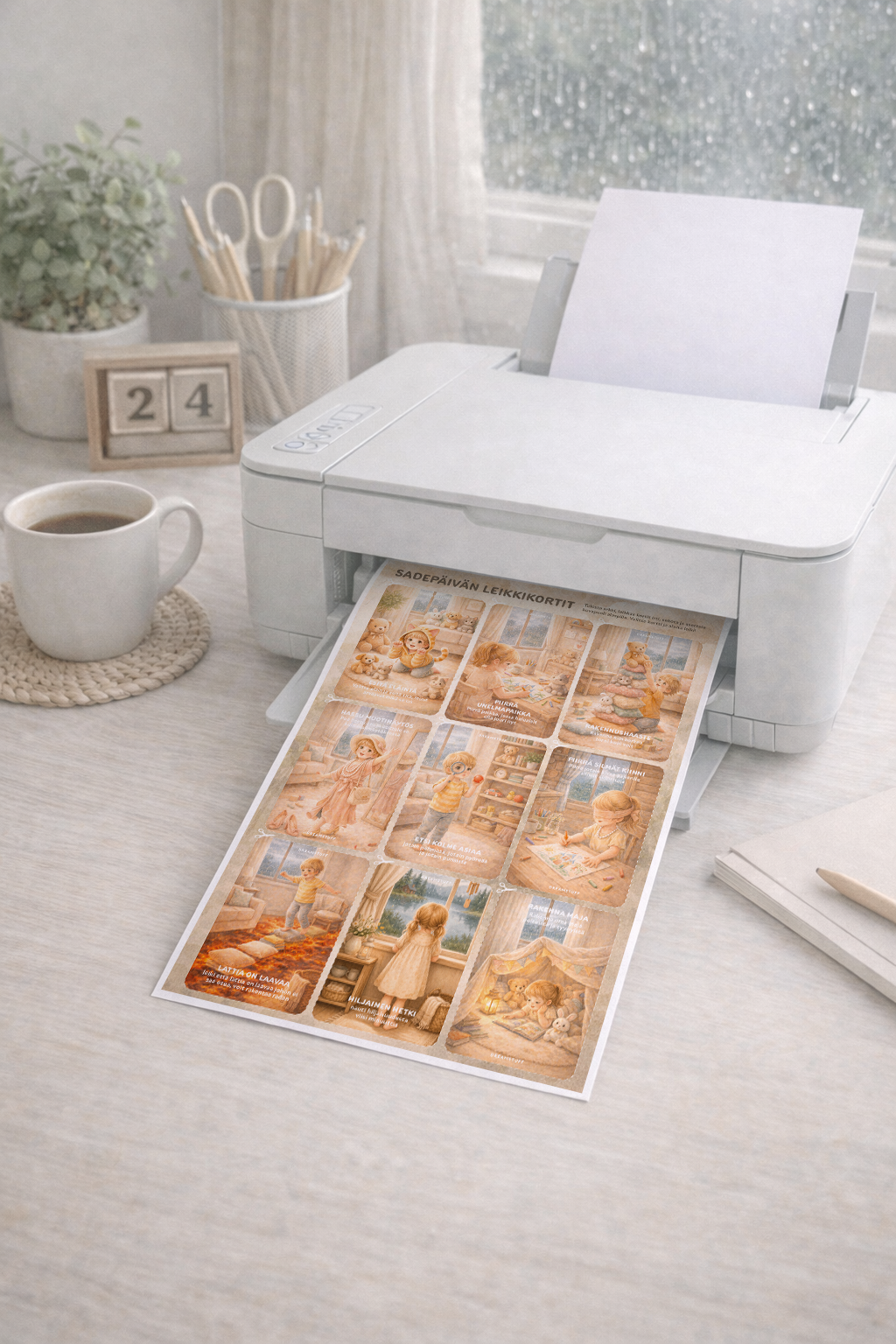 Sadepäivän leikkikortit on digitaalinen ladattava tuote, jonka voit tulostaa helposti kotona.