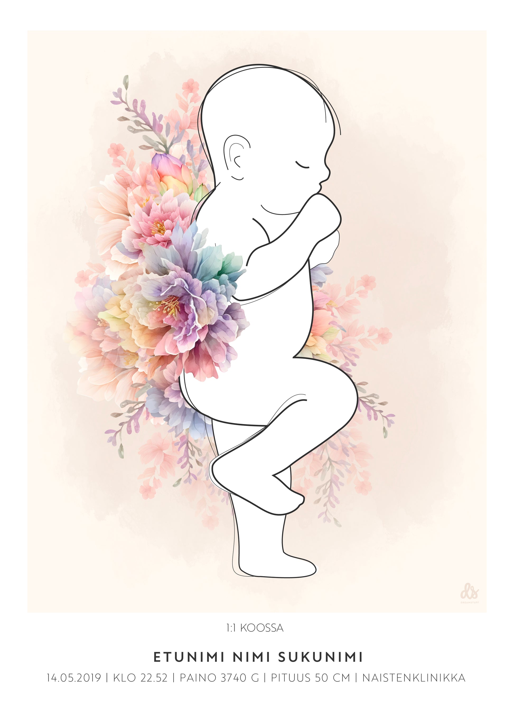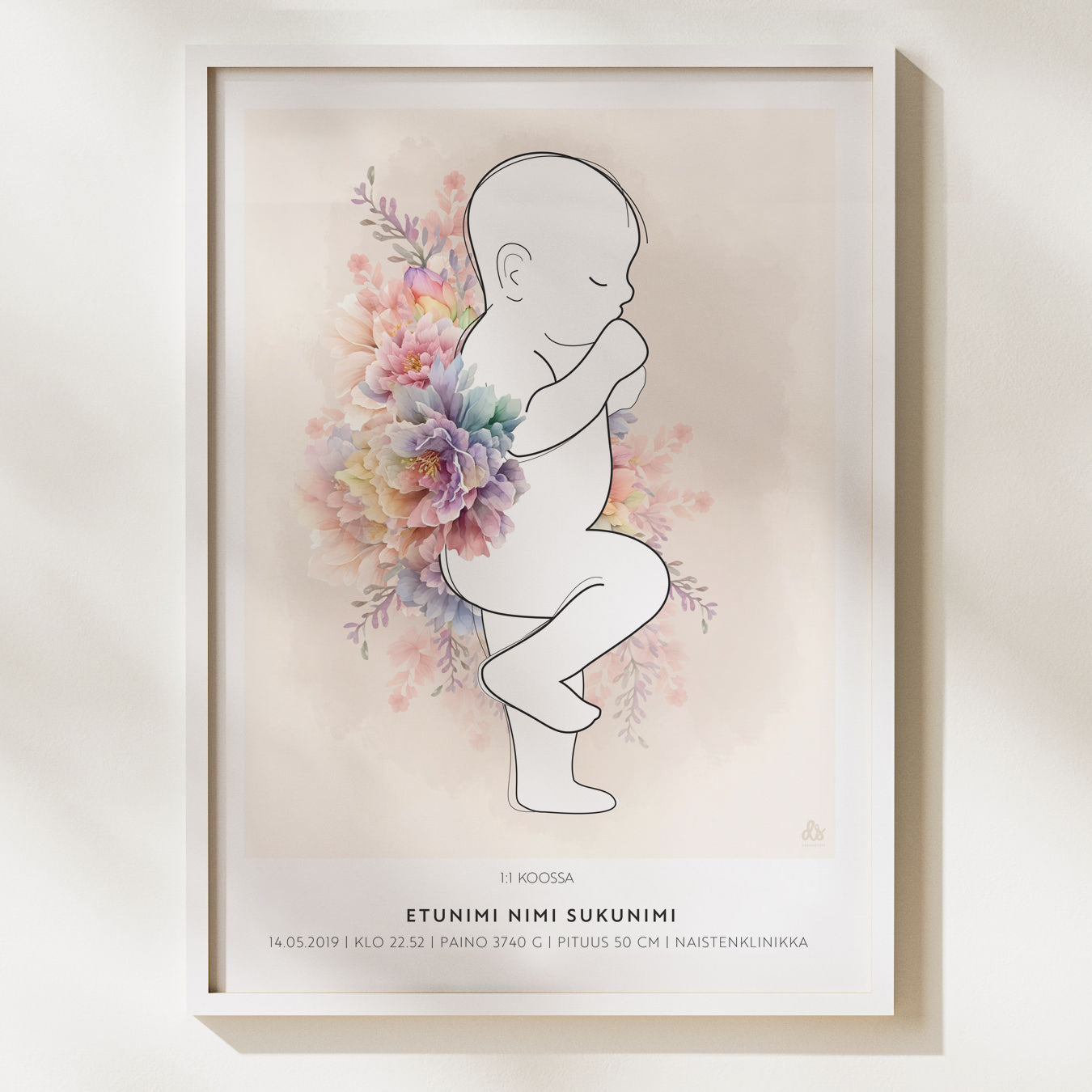 1:1 mittakaava – Juliste suunnitellaan tarkasti lapsesi syntymäpituuden mukaan, jolloin tulos on harmoninen ja oikeassa suhteessa.