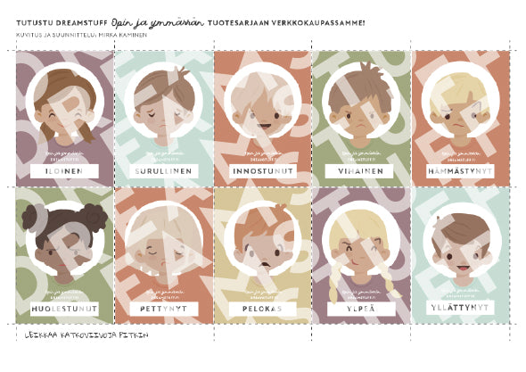 Dreamstuffin graafikon suunnittelemat tunnekortit auttavat lasta ja aikuista tunnistamaan ja sanoittamaan tunteita arjessa. Arkeilla on yhteensä 20 erilaista tunnekorttia, joissa jokainen tunne on saanut oman ilmeensä ja värikkään taustansa. Toisin kuin monet geneeriset ja yksinkertaiset tunnekortit, nämä kortit on suunniteltu visuaalisesti kauniiksi ja houkutteleviksi – jotta niiden käyttö olisi lapselle kiinnostavaa ja innostavaa.