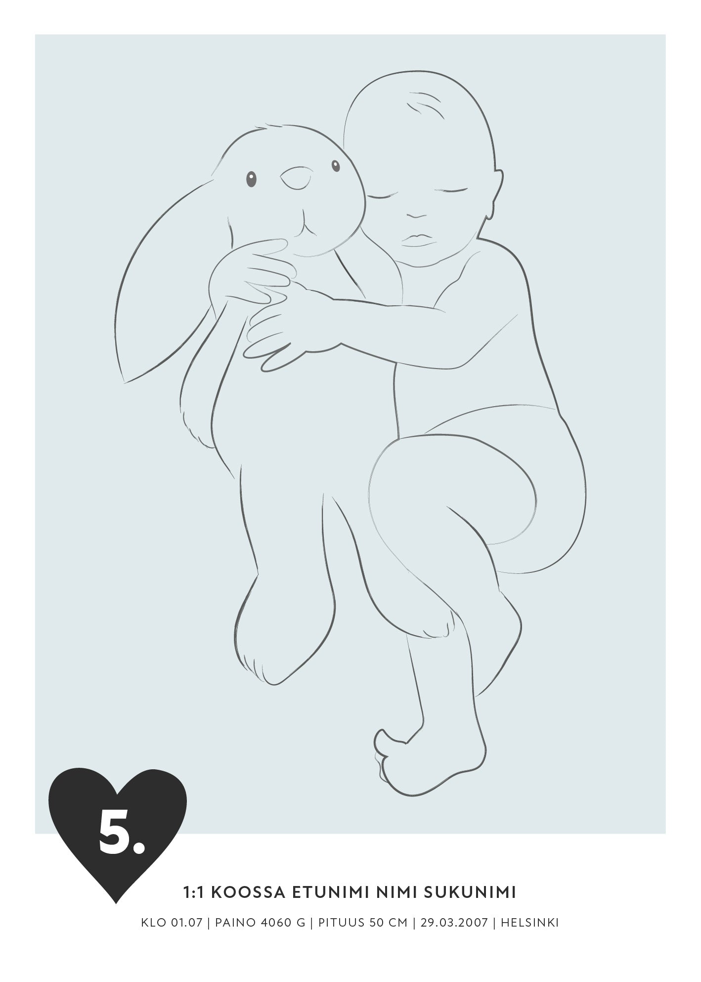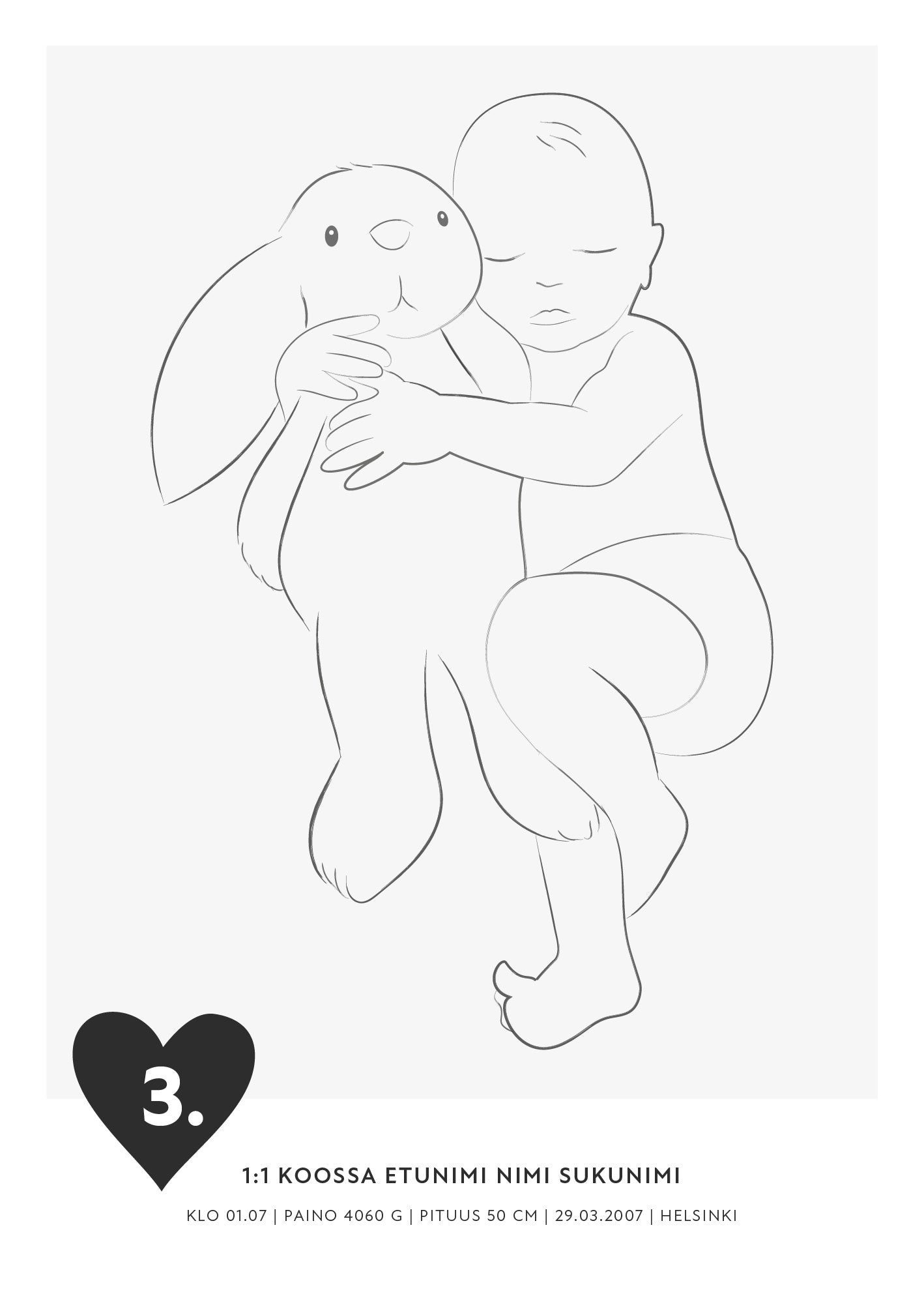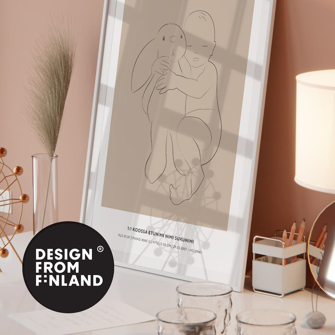 Syntymäjulisteen vauva skaalataan 1:1 kokoon lapsesi syntymäpituuden mukaan. Tämän syntymäjulisteen vauva skaalataan päälaelta alempaan kantapäähän antamillasi tiedoilla. Tämä on erinomainen sisustusjuliste lahjaksi tai muistoksi itselle. Kuva elää ajassa ja sen voi hyvin myös ripustaa muualle kuin lastenhuoneeseen.