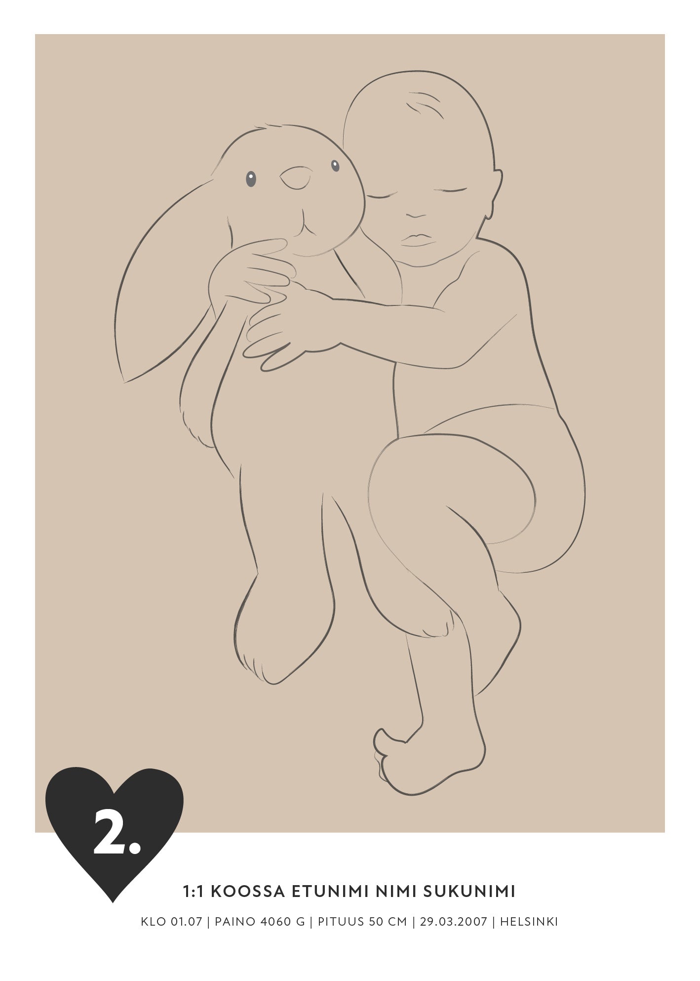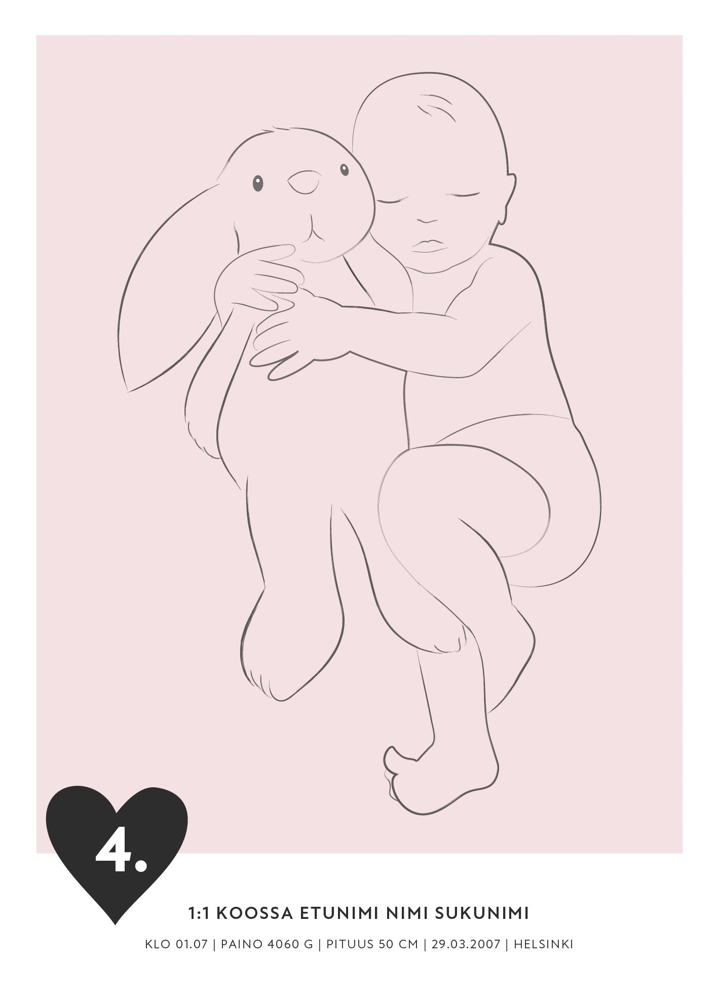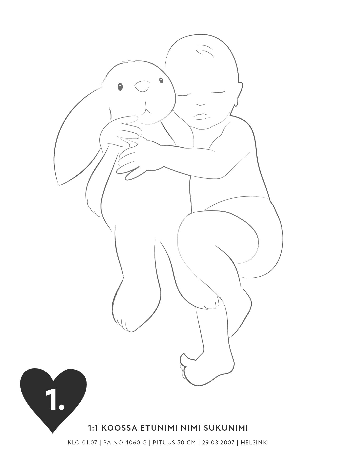 Syntymäjulisteen vauva skaalataan 1:1 kokoon lapsesi syntymäpituuden mukaan. Tämän syntymäjulisteen vauva skaalataan päälaelta alempaan kantapäähän antamillasi tiedoilla. Tämä on erinomainen sisustusjuliste lahjaksi tai muistoksi itselle. Kuva elää ajassa ja sen voi hyvin myös ripustaa muualle kuin lastenhuoneeseen.