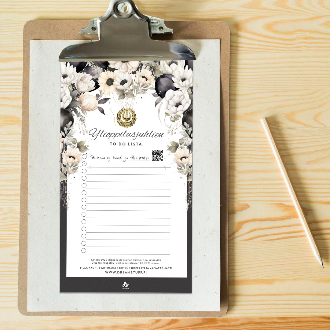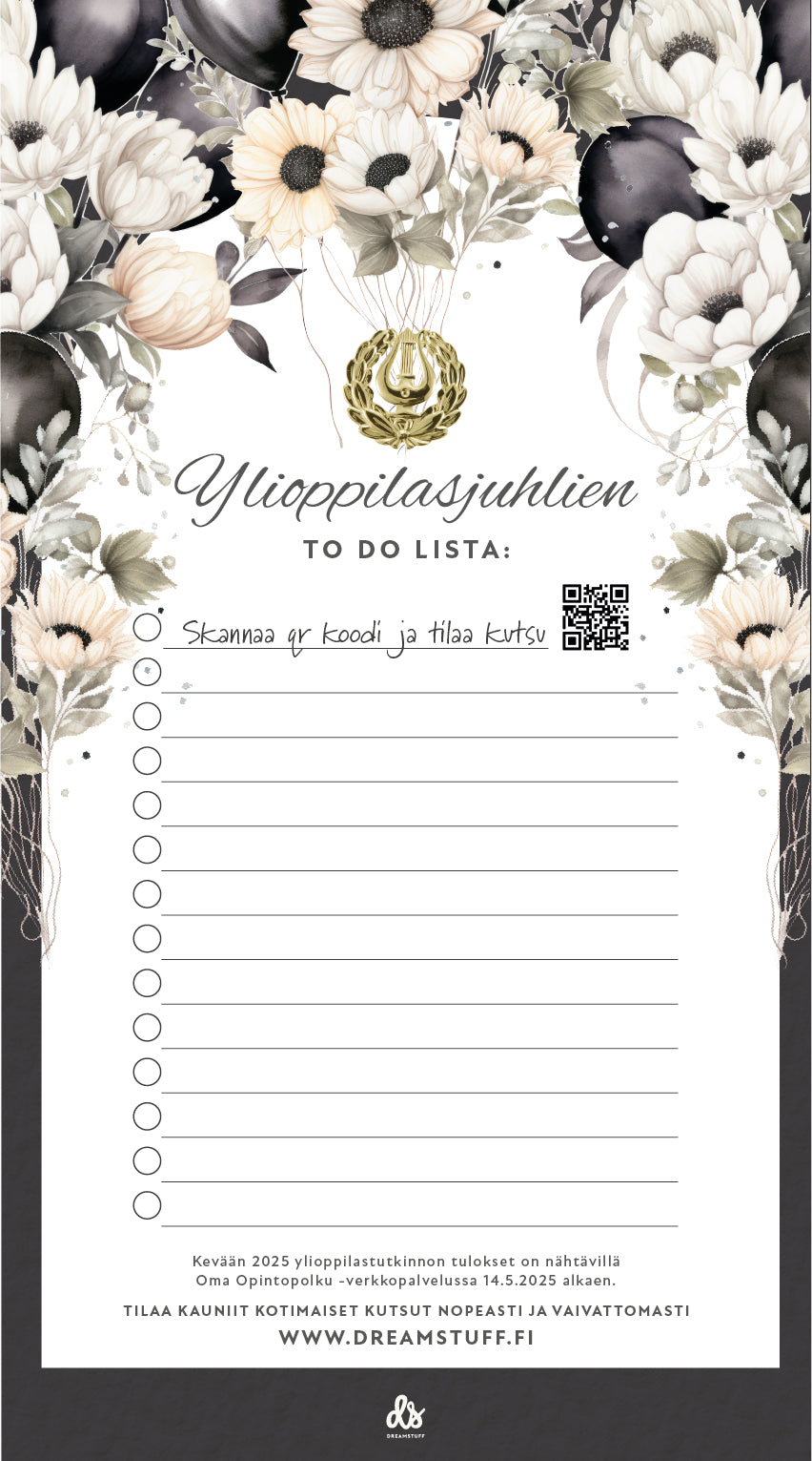 Dreamstuff tarjoaa ylioppilasjuhlia järjestäville kauniin "to do" muistilistan helpotukseksi kiireiden keskellä.