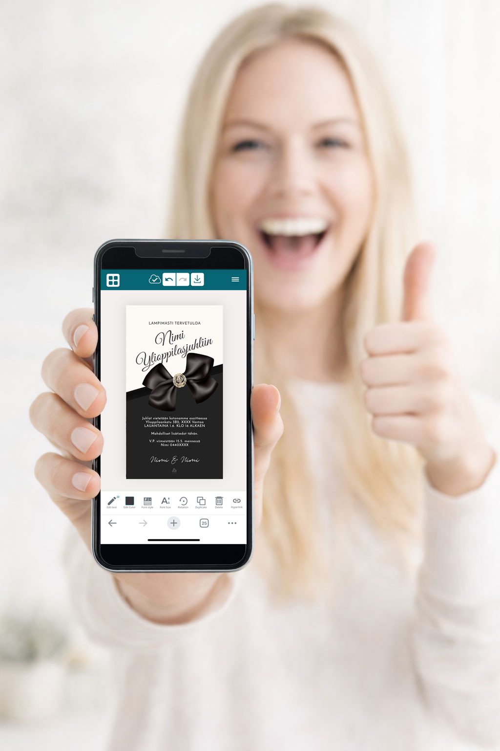 En inbjudan skickas till dig via e-post, där du till exempel kan spara inbjudningsbildfilen till din mobiltelefons foton, därifrån kan du skicka den till dina gäster som en bildfil (messenger, whats up, etc.)